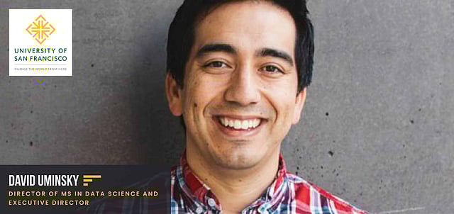 David Uminsky is the Director of MS in Data Science and Executive Director of the Data Institute, University of San Francisco. He has been the graduate director for the MS in Data Science program for the past five years and was recently appointed as the Executive Director of the Data Institute. David's journey began by earning a BS in Mathematics from Harvey Mudd College and a Ph.D. in Mathematics from Boston University. Before joining USF, David was a combined National Science Foundation and UC President's Fellow at UCLA, where he was awarded the Chancellor's Award for post-doctoral research. David was selected in 2015 by the National Academy of Sciences (NAS) as a Kavli Frontiers of Science Fellow. Each year, 100 researchers under the age of 45 are selected by the academy, and 20% of the current NAS were previous Kavli Fellows.