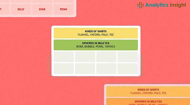 The categories use different content types which include both products and physical objects alongside software and naming conventions from literature and things to do. The primary task involves identifying proper word groupings due to words that potentially belong to multiple categories. The game permits just one correct setup for each set.