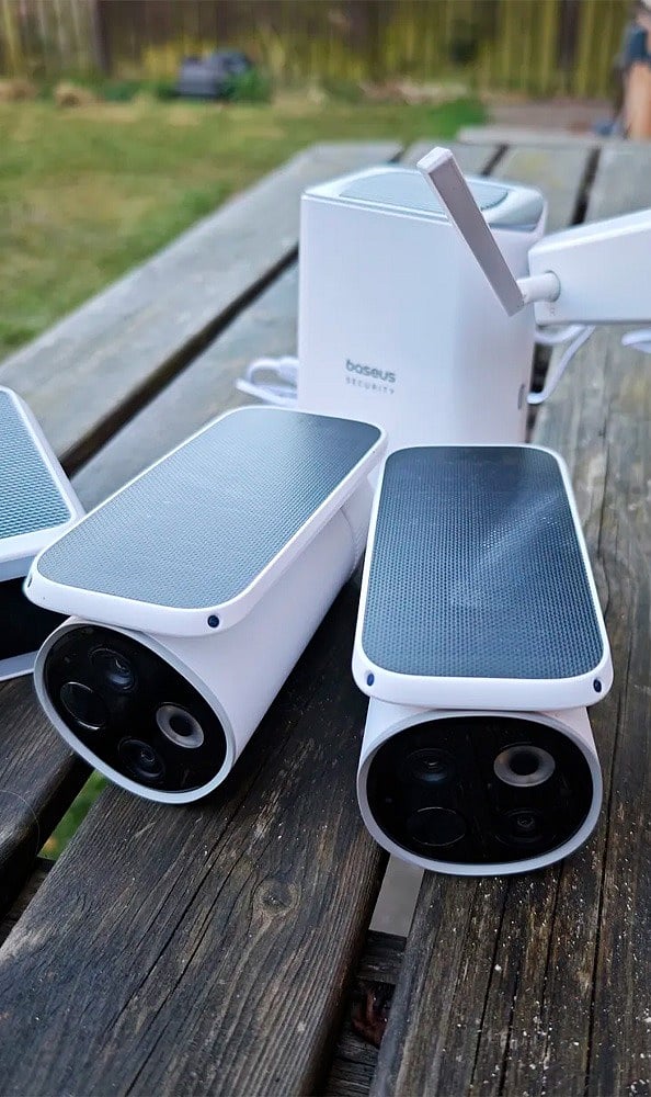 Eufy SoloCam S340: Solar charging capability, local storage without subscription, dual cameras for zoom clarity, AI tracking, and strong data privacy focus.